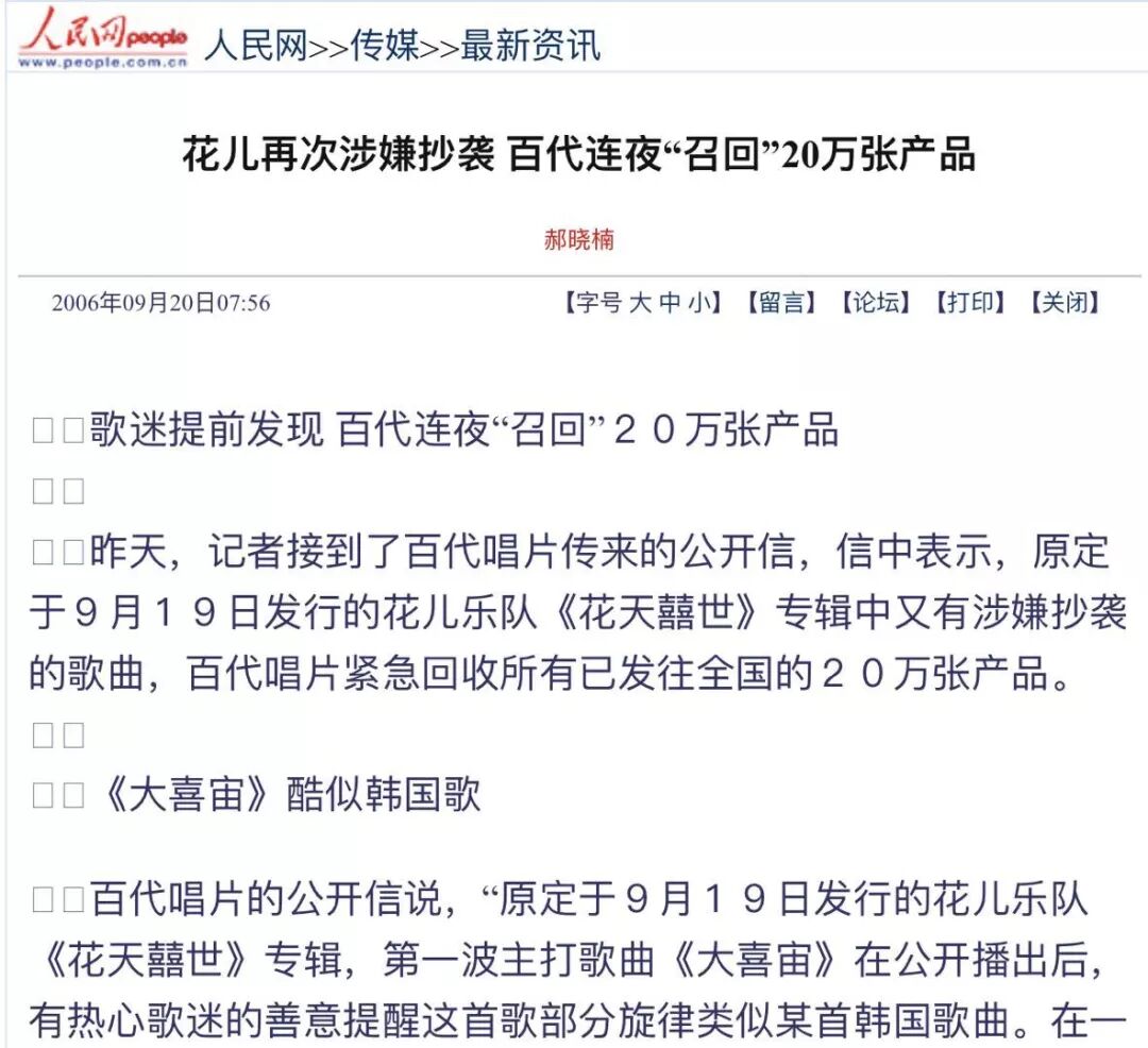 但随后2004年,花儿乐队的第四张专辑《我是你的罗密欧》却让他们陷入了抄袭的丑闻中,这张专辑中差不多有一大半的歌都被网友扒出了“原版”。而接下来的《花季王朝》和《花田囍事》也同样存在着抄袭的问题,后者更是因为法律风险被百代唱片紧急收回。