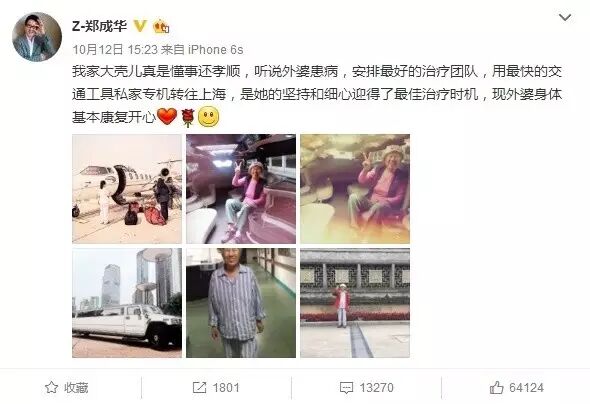 但其实也不是一点消息没有的,10月上旬郑爽爸爸发微博说郑爽给外婆搞了私人飞机到上海看病,引发争议。
