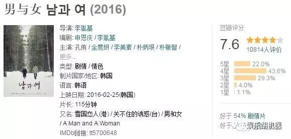 这部由孔刘和全度妍主演的电影—《男与女》,豆瓣评分7.6,好于54%的剧情片,好于92%的情色片。