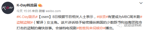 同样是今天上午,韩媒爆出消息称徐珠贤有希望成为MBC周末剧《盗贼盗贼》的女主角。