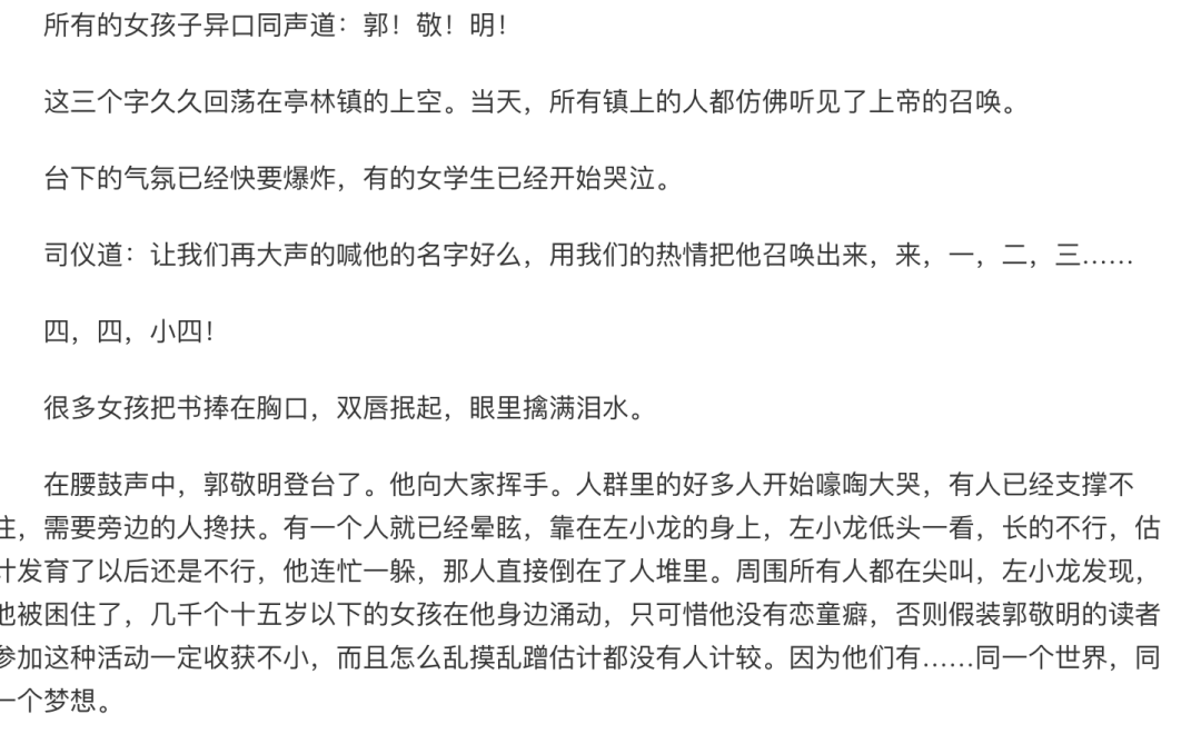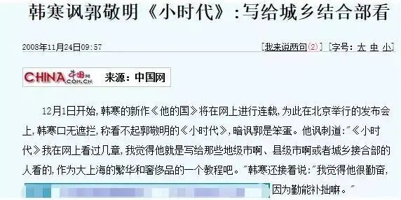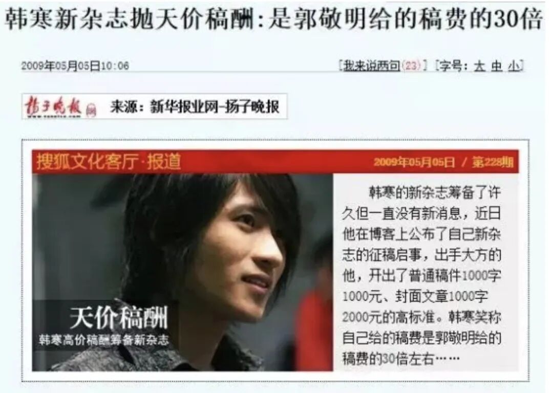 韩寒,「摸着」郭敬明过河 新闻哥 内地男星 2024-02-29 18:54:24 217 创作不易,用心坚持,欢迎请BaGua喝几杯爱心咖啡!打赏并支持本文 打赏并删除本文 本文经授权转载自微信公众号:凤凰WEEKLY(ID:phoenixweekly)活得久就是有一点好处。比如前互联网时代的一些人,总会突然从记忆中活过来,给你一些小小的岁月震撼。韩寒的春节档电影《飞驰人生2》上映,豆瓣评分7.9,成了据说“韩寒最好的一部电影”。就在此时,最近另一条消息也开始发酵:网传,郭敬明将接任时尚杂志《vogue》主编。虽然消息还如子弹飞,但是大家都已经发现,韩寒和郭敬明,这两个原来像筷子兄弟一样并称的人,终于走上了两条路。一个是赛车手,作家,导演;一个是导演,商人,“郭式美学”创始人。想当年,有人将他们称作文坛双子星;如今,仿生韩寒会梦到电子郭敬明吗?“韩少和四娘”2011年,华东理工大学,曾经举办过一场惊世骇俗的辩论赛,辩题为:“韩寒和郭敬明应不应该在一起” 双方辩友你来我往,插科打诨,从事业、人格、履历,甚至星座血型等等方面举例,证明两个人的相似,或者相反性。然而这场辩论从一开始,就是一个圈套:因为能把两个人拉在一起比较的那一刻,命运的齿轮,就开始缓缓转动了。一个是新概念作文大赛的首届一等奖获得者,一个是蝉联第三届第四届的一等奖获得者。韩寒从被一篇《杯中窥人》拉到聚光灯下,郭敬明则带着一篇《假如明天没有太阳》上了桌。光看名字,一篇冰冷尖锐,一篇忧伤绮丽。韩寒自从走入人们视线,就代表着一种人不敢成为的样子。而郭敬明,似乎完全走在韩寒的相反象限。韩寒是上海人,郭敬明是四川18线小城的小镇青年;韩寒是长跑特长生,郭敬明从小就得了败血症,身体很差,个子也不高;韩寒父亲是知名作家,他更是打响高中辍学第一枪,老师问他日后怎么办,韩寒说,“我要靠稿费养活自己”。郭敬明则是那个时代的小镇做题家,通过奋力学习,终于考上了上海大学。韩寒生于斯、长于斯的普通上海,在郭敬明笔下像一只带着铜臭味、冰冷又恐怖的巨兽。所有构成他们本人的元素都是反义词。一场神奇的比赛,却串起了他们两人并肩的人生。最开始,两个人还能相安无事。初出茅庐的那几年,韩寒写了《三重门》、《毒》、《长安乱》。除了写书还写博客,韩寒先骂应试教育,再骂积弊流弊,骂明星还骂网友。甚至在他24岁的时候,他和评论家白桦吵得天翻地覆,最后洋洋洒洒写下一篇《文坛是个屁,谁也别装逼》。白桦气得说这篇文章侮辱他,导演陆川、高晓松都出来和韩寒对骂——最后,都被韩寒骂退了博。骂到最后博客疯狂被删,韩寒无奈说:手快有,手慢无——这成了那一年的流行语。而韩寒,获得了年度十大博客之名。而那时刚来上海没多久,缓缓展开文学梦的郭敬明,则掏出了《幻城》、《梦里花落知多少》、《夏至未至》。男主女主,永远是忧伤脆弱,穿着白衬衫靠着香樟树,45度角仰望天空的;情节,永远是结合出轨、失恋、堕胎为一体,极尽吸引眼球之能事的。与此同时,郭敬明的文字又写得缠绵悱恻、忧伤细腻。这种书,就像中学生爱吃垃圾食品,确实不怎么样,但吃了也不会死。然而很快,两个人就开始进入相爱相杀模式。韩寒直说,郭敬明的书是给城乡结合部的人看的;甚至把他写进了《他的国》里,用一段极尽夸张之能事的文字,毫不留情地讽刺郭敬明的浮夸风;郭敬明办了杂志,韩寒也办,不仅办,还要说“我的稿酬是郭敬明的30倍”。韩寒直言和郭敬明“男女有别”,虽然只见过一面,但是郭敬明“不好看,不在他的审美上,除了钱比自己多,自己什么都更强”。相比韩寒的刀剑相向,郭敬明只会冷处理。新概念大赛十年,两个人终于同台。韩寒说,久仰。郭敬明则说,我不了解。在上个互联网时代,这俩人还是“四娘”和“韩少”,在互联网所有人的见证下,每天乐此不疲地上演“他逃他追”的戏码。然而两个人骂归骂,他们的路径却是奇迹般地相似——郭敬明很快签下了落落、七堇年,把自己变成一支队伍,紧锣密鼓地出了《最小说》、《文艺风赏》、《文艺风象》等杂志。最小说刚一出版,一个月就卖出了50万册。韩寒紧随其后,他的《独唱团》2010年上线,韩寒、罗永浩、蔡康永的文章赫然在列。甚至和这些人齐名的,还有我们新媒体人的god mother ——咪蒙女士。这本杂志首日发行了10万册,最后总共卖了150万。但是,仅此一期,第二期再也没有开印,就此绝版夭折。哪怕只是光看封面,就能发现这两本书的截然不同之处。两个人你争我抢,从新概念作文成立,斗到杂志停刊;从纸媒最好的时代,斗到路边的报刊亭倒闭;从大家都在看书的时代,斗到大家都爱看电影的时代。2014年,《小时代》和《后会无期》前后上线。一个烂得出神入化,用大幅度的华服、美女、帅哥的堆砌,衬托PPT式电影的浮夸;相比之下,韩寒的赛车片子最多算是平平无奇,写自己的故事,当自己的导演,但也称不上佳片。不过这一次,和之前不同。郭敬明夸韩寒,《后会无期》的后期制作很快,自己做不到。而韩寒回夸,《小时代》系列找到了自己的观众,郭敬明在专业范畴内领域里,做得很不错。从来针锋相对的两人,第一次对彼此表达了认可。大人,时代真的变了。被偷走的这十年或许时间真的会让人成熟。然而我的领导王富贵说过,中年男人最害怕的事,不是自己过得不好,而是竞争对手过得太