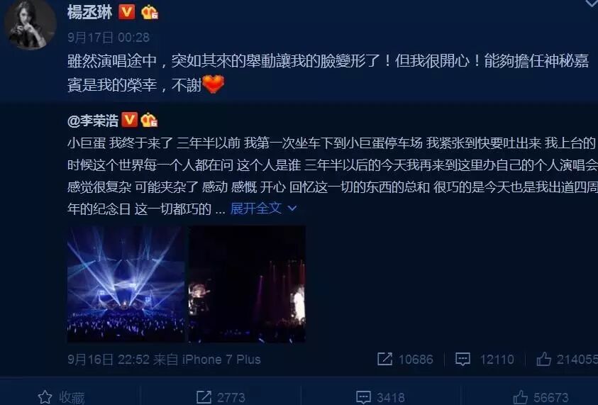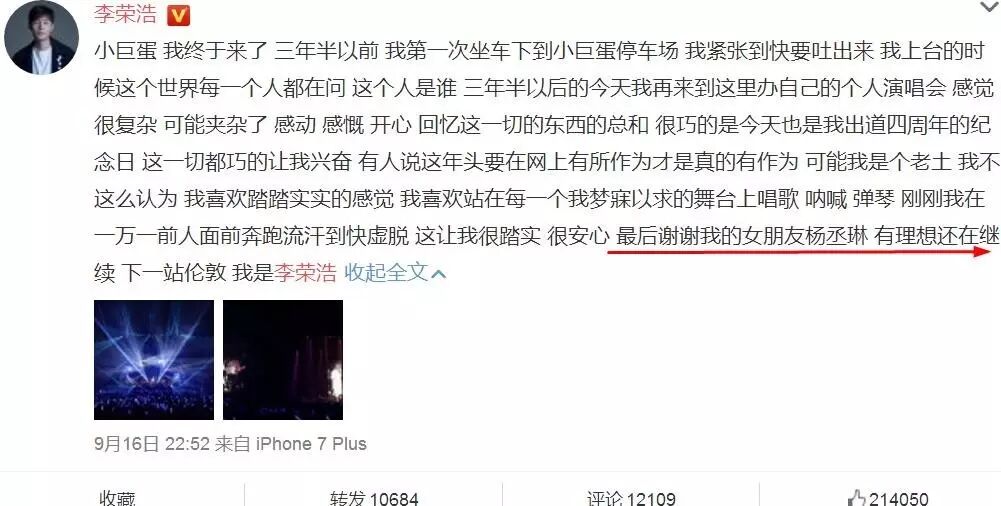 演唱会之后,李荣浩发了一篇微博,纪念一下自己这四年的努力,末尾不忘再秀一波恩爱。