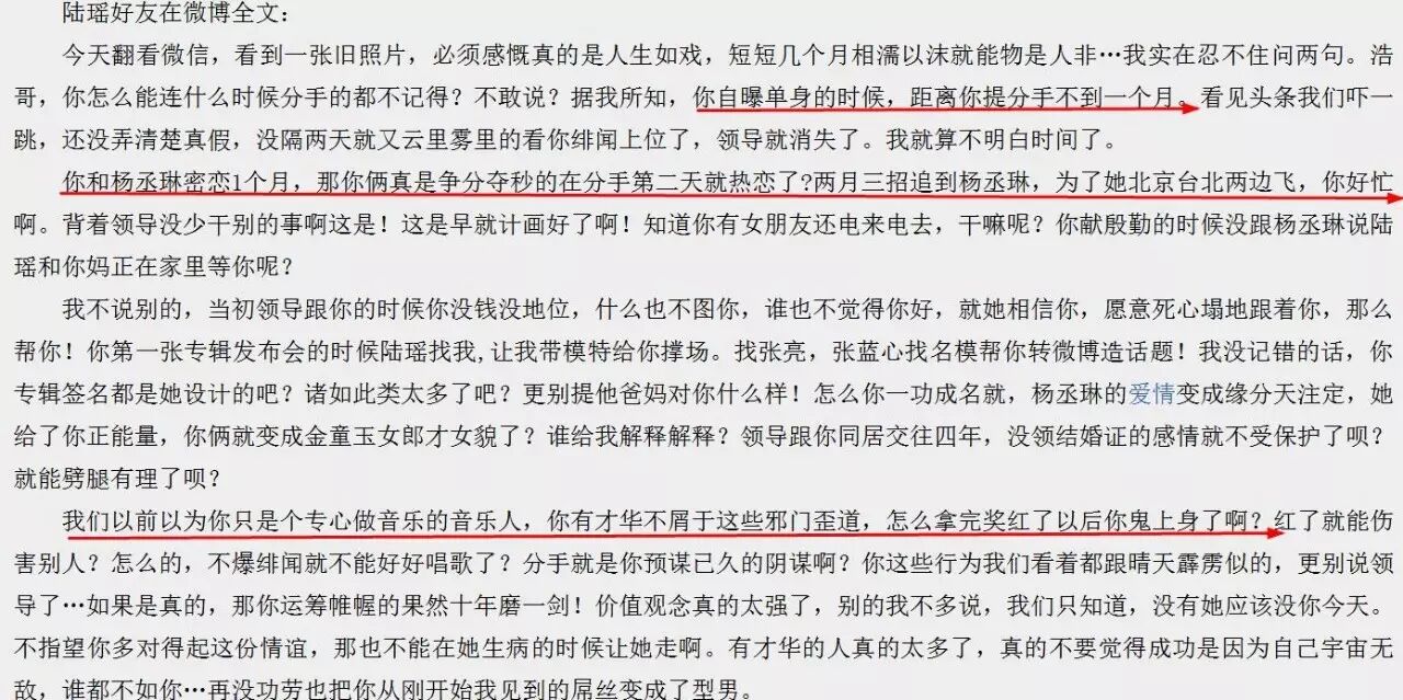当初李荣浩刚被媒体爆出热恋杨丞琳1个月后,陆瑶的好友张小姐就在微博po了一篇长文,指责李荣浩劈腿。