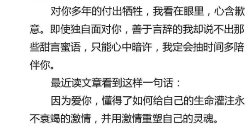 他知道妻子为家庭付出了什么,所以到了是现在他也是心底里认可和敬重妻子。