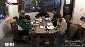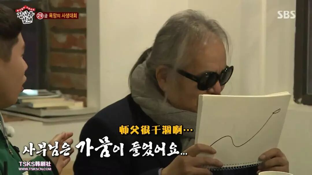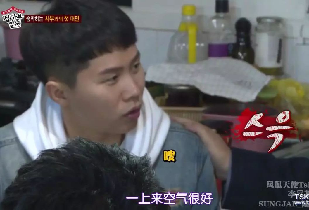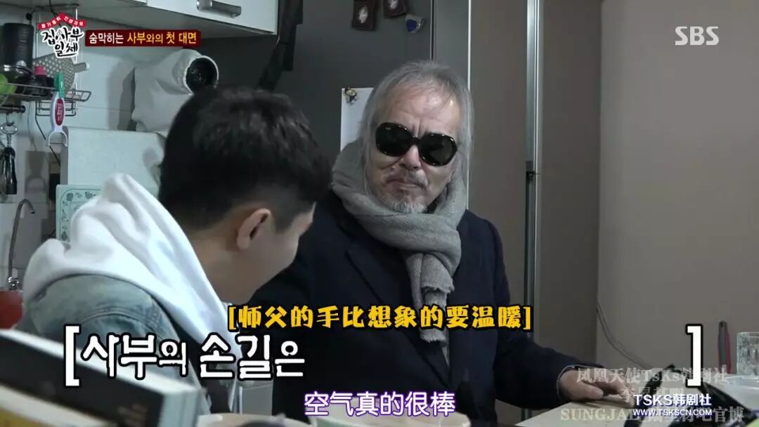 和师父坐在餐桌上谈话,滔滔不绝的梁世炯突然被师父抚摸,全员慌张,以为师父要发火让他安静点呆着