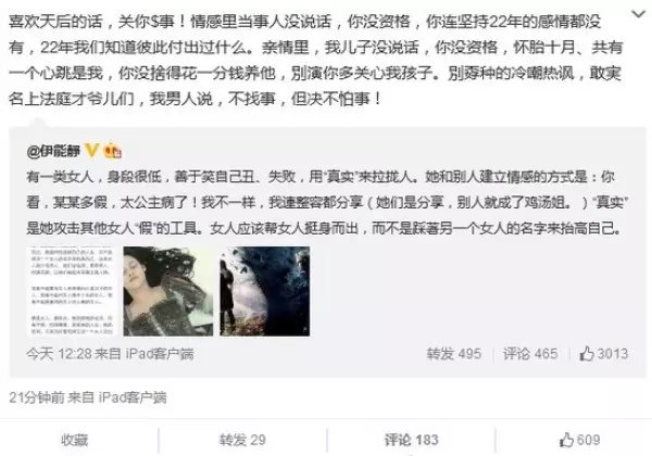 中午时分,伊能静突然在微博发长文简述自己的生活经历,暗讽某类女人,称“有一类女人,身段很低,善于笑自己丑、失败,用“真实”来拉拢人”,直言“女人应该帮女人挺身而出,而不是踩著另一个女人的名字来抬高自己 ”。因为语气强硬,且没有明确指出对方是谁,一时间让粉丝摸不着头脑。没想到一个小时后,伊能静继续发飙,直接爆粗口“喜欢天后的话,关你$事”,霸气喊话“別孬种的冷嘲热讽,敢実名上法庭才爷儿们,我男人说,不找事,但决不怕事 ”。