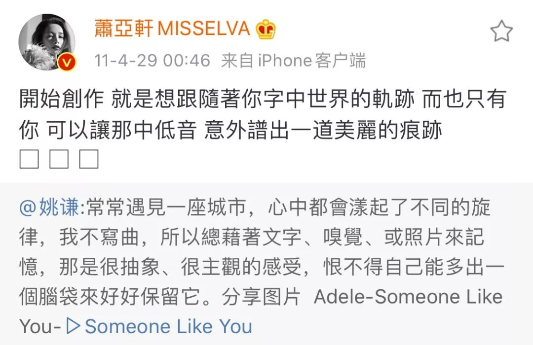 多年之后,萧亚轩在微博上说自己开始创作,就是因为想跟随着姚谦字中世界的轨迹,只有姚谦,可以让那中低音,意外地扑出一道美丽的痕迹。