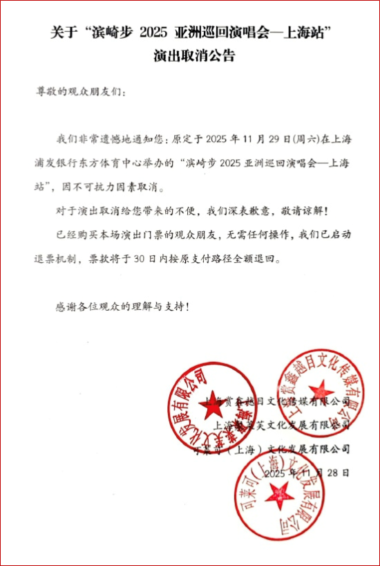 滨崎步“2025亚洲巡回演唱会”(上海站)原定于2025年11月29日举行,就在演出前一天,11月28日,主办方发布了演唱会取消公告,表示因不可抗力因素演出取消,门票将于30天内全额退回。