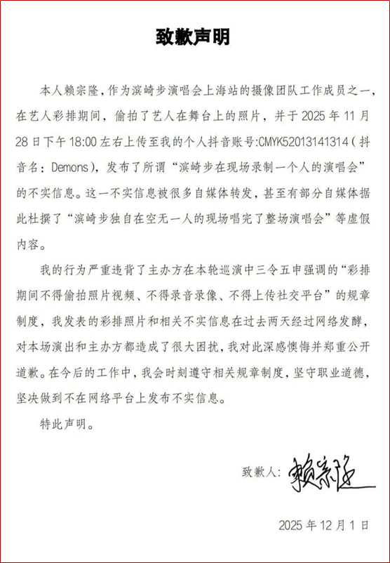然而剧情很快就反转,12月1日多家官媒辟谣:所谓的滨崎步“一个人的演唱会”信息不实,系彩排期间被偷拍,摄像团队人员公开致歉。