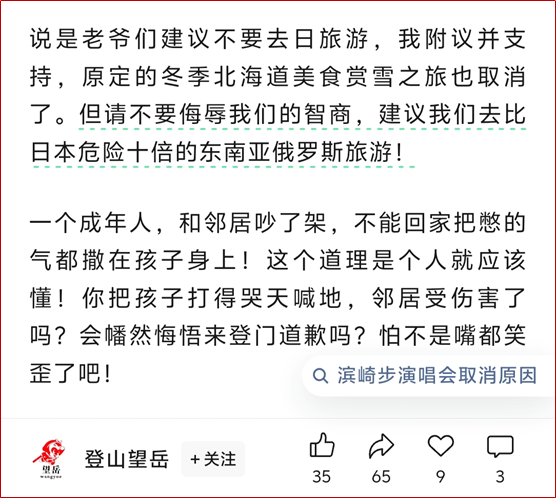 他对国家叫停赴日旅游一肚子不满,说这是“老爷们”的决定。其实国家也没禁止赴日旅游,只是发出了相关旅游风险警示而已,如果你执意要去,也没人拦着你。