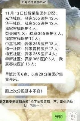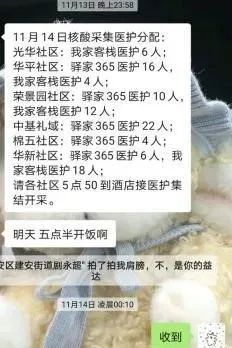 11月11日下午五点,刘雨鑫带领45人到达第一个支援地点,街道主任早早到达酒店等候医护志愿者们,办完入住后,一部分志愿者立刻前往社区开展采集核酸的工作。