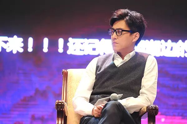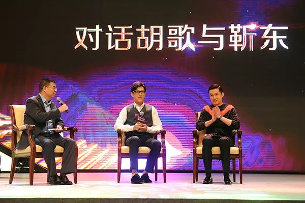 就在同一天,靳东老师在会场上与胡歌对谈时,画风还是这样:
