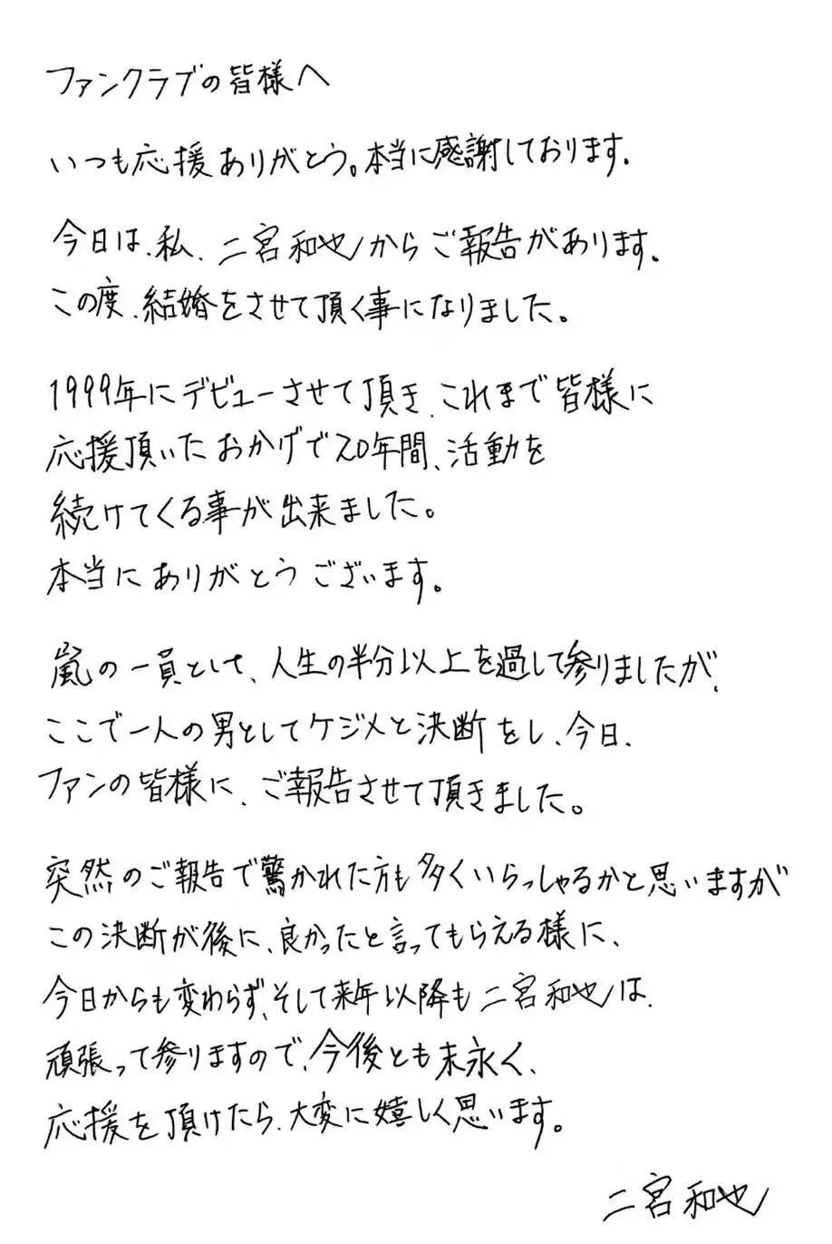 这次两人是在粉丝俱乐部的网页上公开的喜讯,以下是樱井翔的告示。