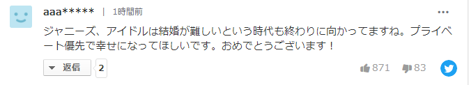 杰尼斯,“偶像结婚很难”的时代也在走向终结呢。希望能以个人生活优先变得幸福。恭喜你!