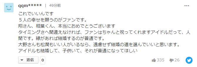 翔,相叶,真心的恭喜你们!只要时机是对的,粉丝们也会好好的祝福的,毕竟偶像也是人。遇到合适的人就会结婚这是很正常的事情。
