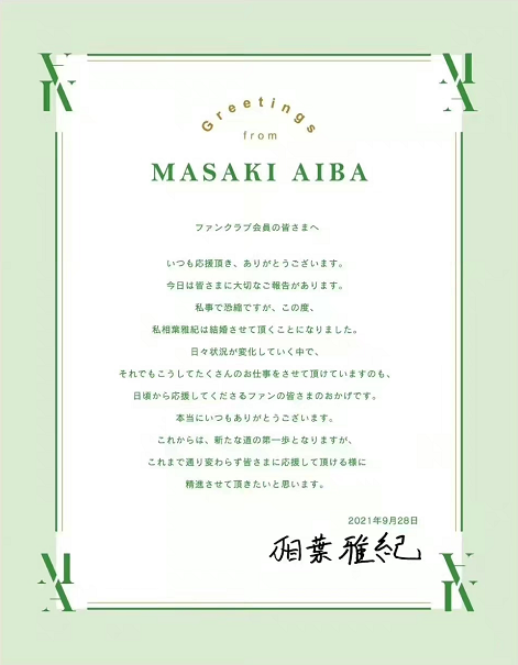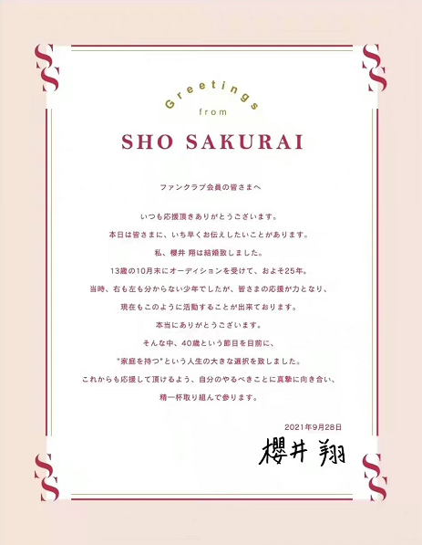 一直以来谢谢各位的支持。今天想要早一些向大家传达一件事,我樱井翔结婚了。