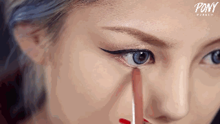 Step6:由于亚洲人很多都是包眼角,而欧美人大多的眼型大多都是开眼角,因此猫眼的重要延长方法就是用眼线笔在眼头出勾画出开眼角。