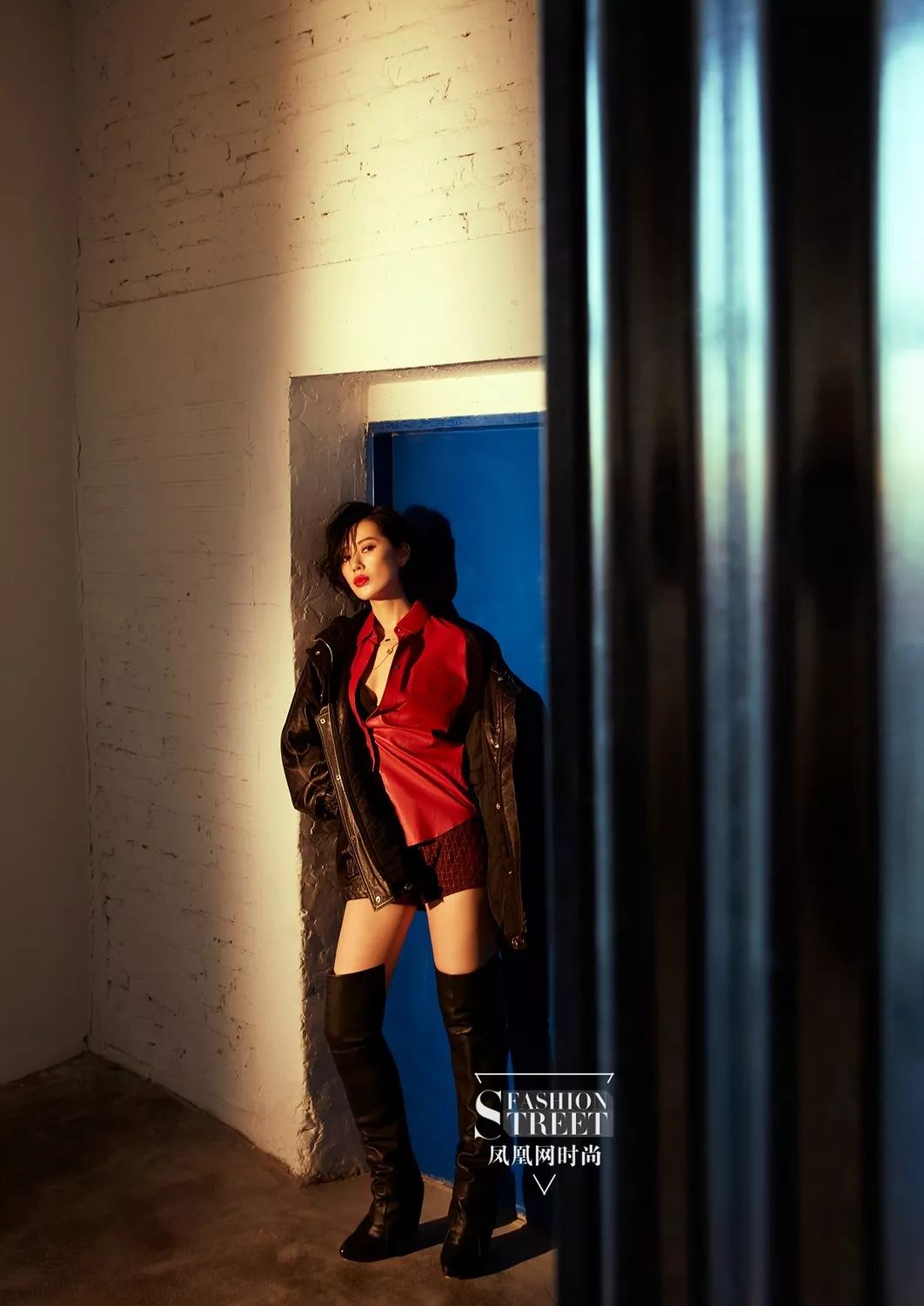 皮衬衣+皮夹克+皮靴的组合帅气有型,浓郁的红与黑又是永恒的经典配色,这样的一套LOOK统一而具有层次感。而选择打开领口,搭配一条短裤,无疑是更性感的。