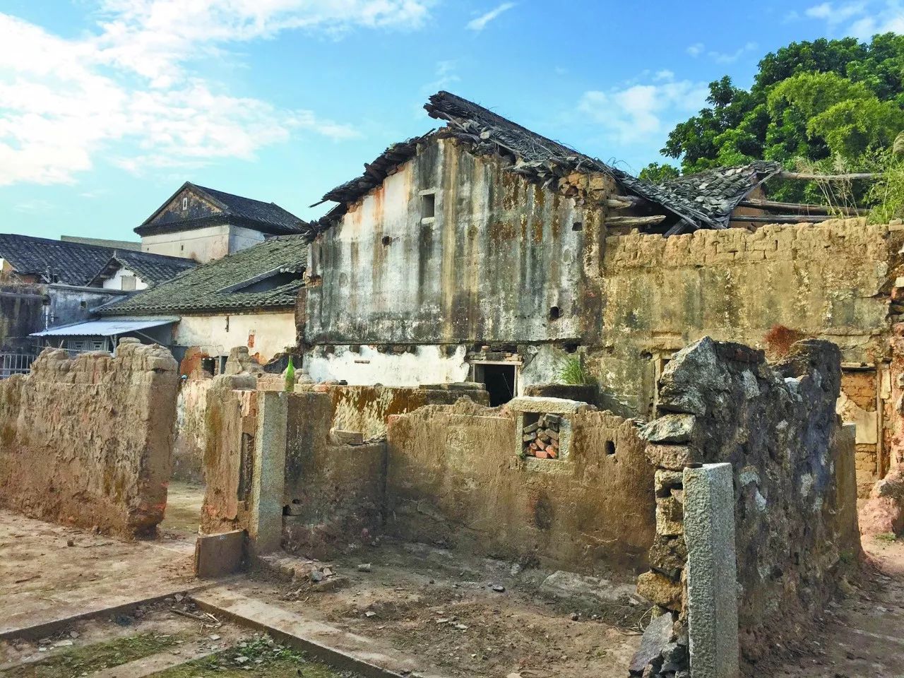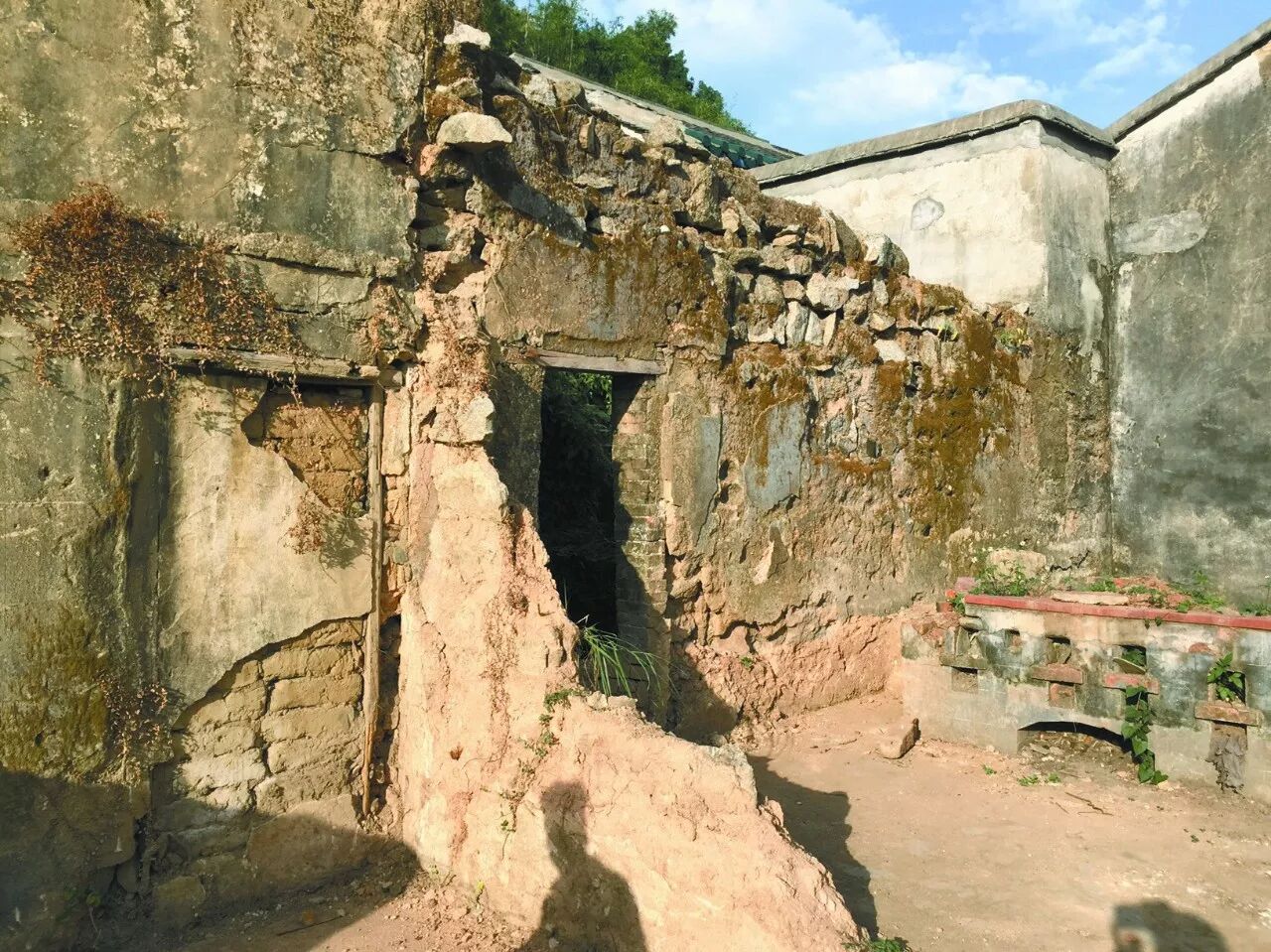 围屋的正门尚算完整。从大门进入,迎面是祠堂,建筑虽然破旧但大致完好。从祠堂往内部走,破败的景象就渐次暴露。“你看,这里本来是一座房子,也不知道是什么时候倒掉的,现在变成菜地了。”陪同的社区工作人员说道。记者望去,“菜地”的四周,残留的墙基还清晰可见。