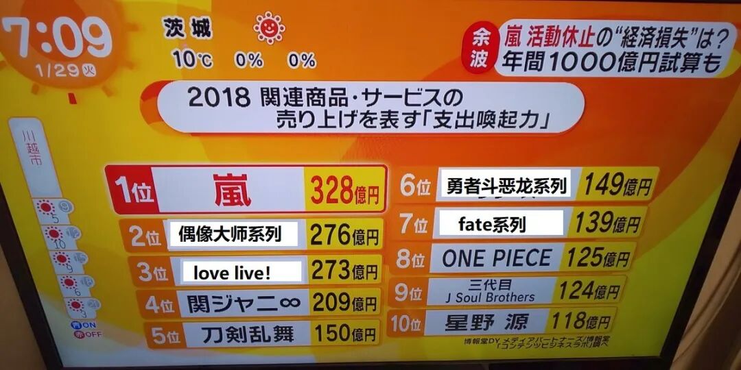 2018年周边商品/服务吸金排行榜中,岚排名榜首,偶像大师系列、lovelive、关8、刀剑乱舞、海贼王紧随其后,而星野源凭一人占据一席之地。