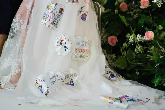 林丽吟还特地在自己设计的婚纱裙摆处,融入了夫妻二人的爱情童话故事书贴图,有点浪漫?