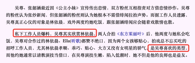工作人员还爆料,说“吴尊真正心仪的对象是林依晨,戏外两度约她吃饭”,还点评说吴尊表示合作过的林依晨、Ella都是很好的女孩,“尤其林依晨……是吴尊喜欢的类型”。