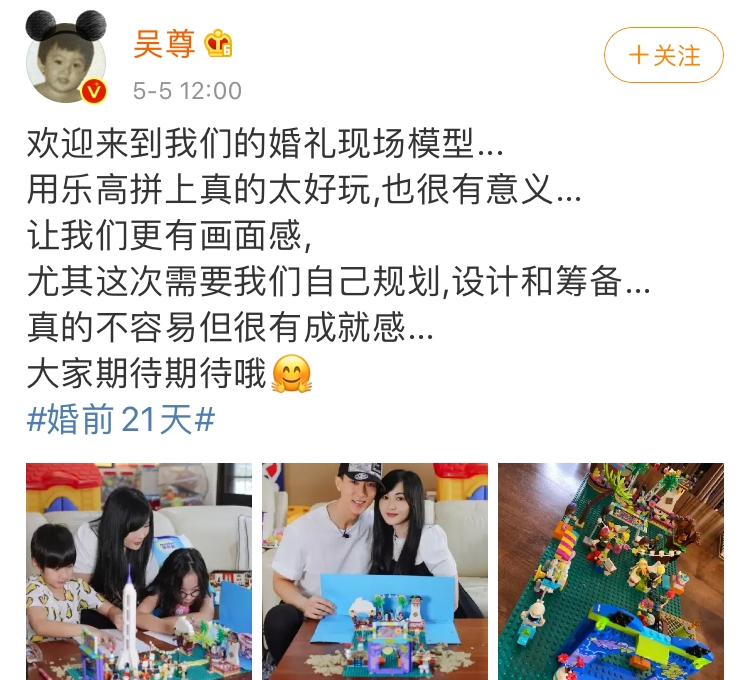 晒自己活泼,又说用乐高来拼婚礼现场模型,用心筹划,