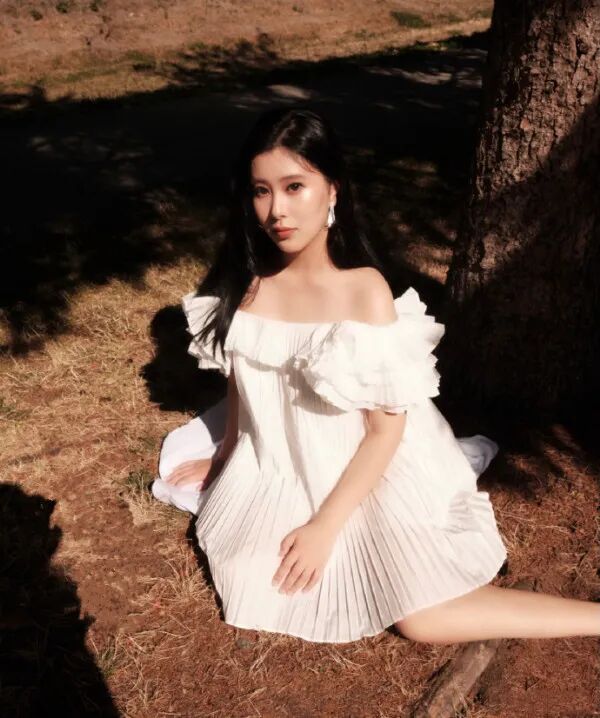 年轻的小姑娘们的确具有超强的时尚驾驭力,但是服饰造型也不能过于繁复,尤其是这种唯美梦幻的风格,版型和样式都要简洁一些才好,杨海润的这件裙子就是如此,没有过多的设计和点缀,从上到下清一色的纯白,看上去干净得如同白纸似的,很容易制造出清纯的美感,突出杨海润身上纯净的少女气息,而大面积的“风琴褶皱”又能够起到显瘦的效果,这样也不用担心白色会穿出显胖的负面效果了。