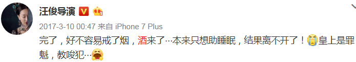 拍摄期间,《如懿传》导演汪俊发了一条微博:“完了,好不容易戒了烟,酒来了……本来只想助睡眠,结果离不开了!皇上是罪魁,教唆犯……”原来,《如懿传》拍摄周期太长,压力太大,导演汪俊一度失眠。然后住在同一个酒店的霍建华就请导演去他那里喝两杯,喝的是威士忌,帮助睡眠。结果汪俊导演就此依赖上了酒。