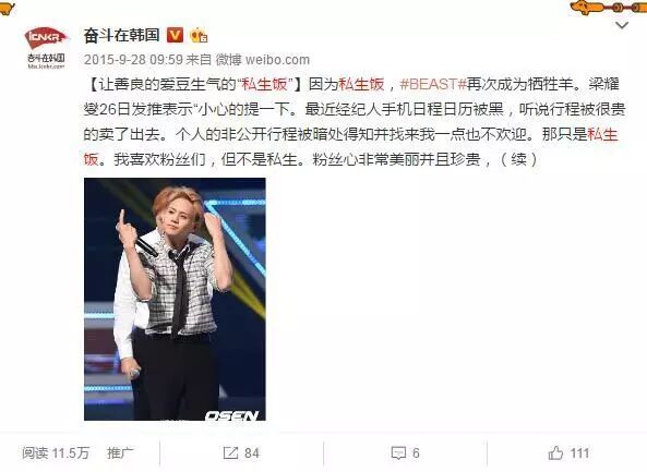 同样也是在15年,当时的beast经纪人的手机日程日历被黑,艺人行程以高价被卖了出去,私生找到了艺人的私人行程。梁耀燮发推表示“我喜欢粉丝们,但不是私生。”