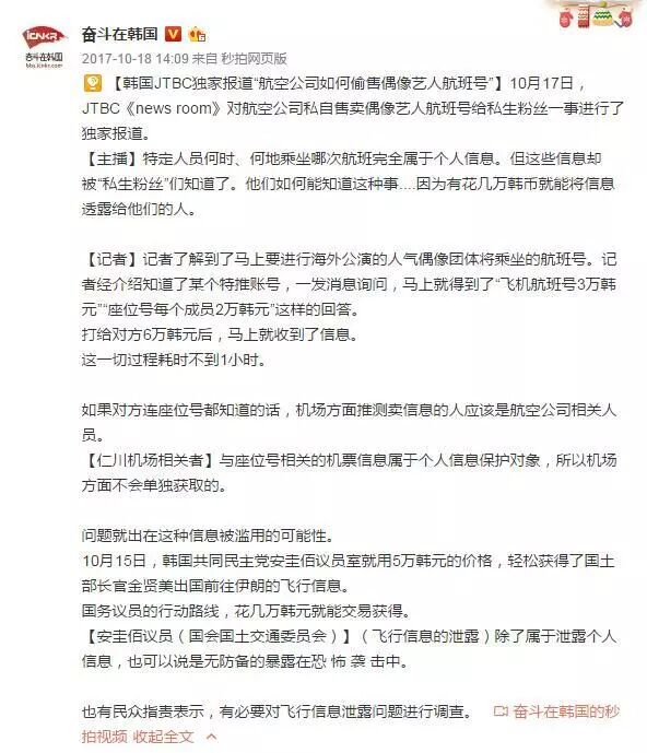 2017年,韩国《JTBC》电视台曾专门做了一期节目,独家报道了“航空公司如何偷售偶像艺人航班号”的内容。