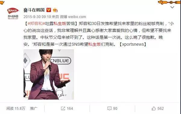 15年中秋节,郑容和家也被私生闯入过。这也是郑容和首次通过SNS呼吁私生饭们克制。