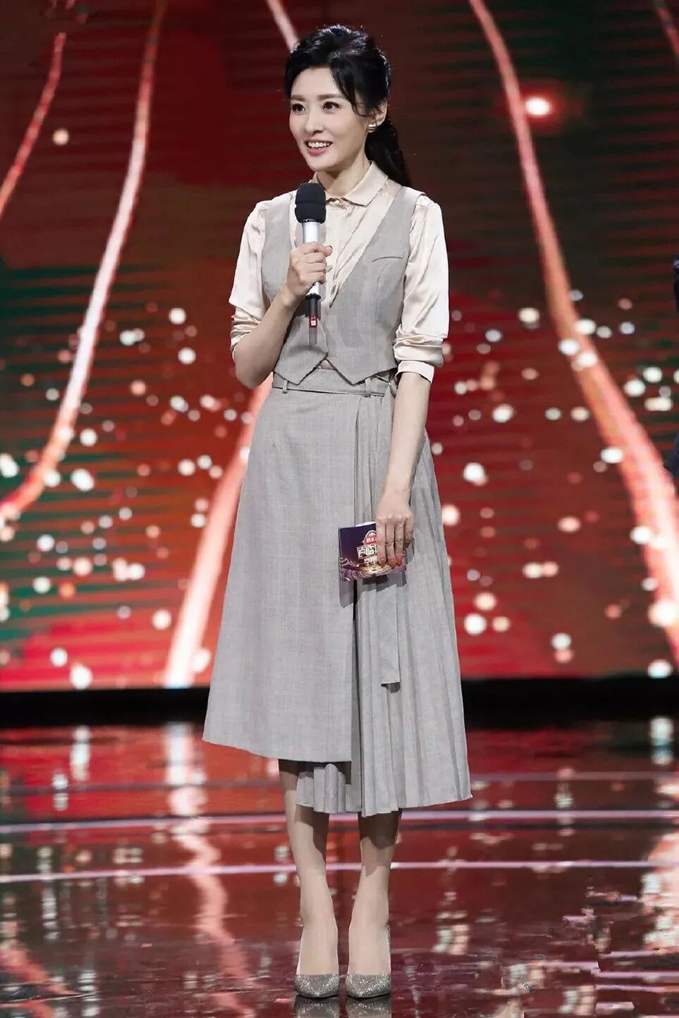 这是站在舞台上面,前面稍微有一点刘海,这样的话显得还是挺温柔的,而且笑的挺开心的,她穿了一件衬衫,外面套了一件马甲,而且扎面套的这条半身裙选择的颜色也是灰色的,看起来还是比较的正式大气