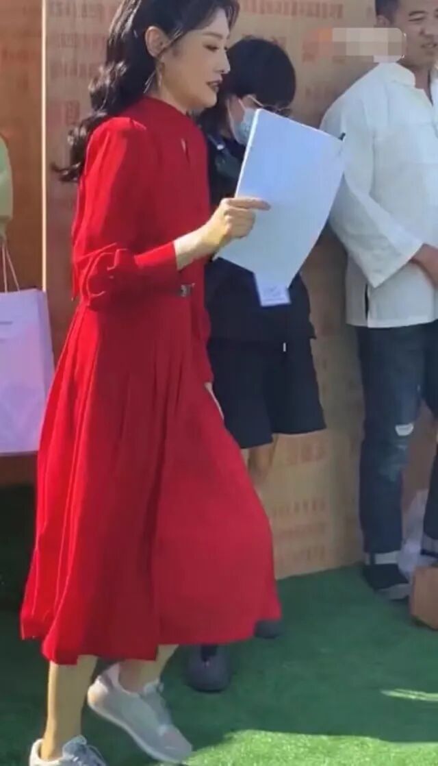 这是稍微打扮了一下,感觉形成整个人更加的高级,她的头发是弄成了卷发,而且就这样披散下来,身上穿着一条红色的裙子,并且这条裙子还是收腰的设计,再搭配她下面穿的这双运动鞋,特别的高级大气呀