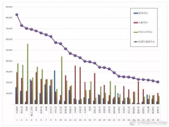 据韩国企业评判所2018年8月22日~9月23日之间对50名男子广告模特的大数据进行的分析结果显示,2018年9月男子广告模特品牌评价TOP5排名为:丁海寅-朴叙俊-元彬-姜丹尼尔-孔刘,6~10名分别为朴宝剑-文晸赫Eric-赵寅成-车银优-朴智星(体育选手)。