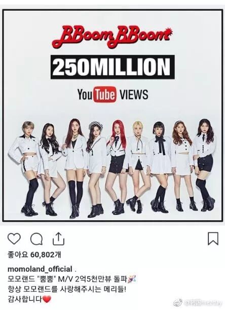 MOMOLAND组合《BBOOM BBOOM》MV点击数突破2亿5千万,是韩国国内小型企划社首支突破2亿五千万的MV,意义十分重大。MOMOLAND通过所属社方面表示:“不光在韩国国内,在世界范围内也取得了不错的反响,感到很幸福,今后也会通过帅气的活动来报答粉丝们”。