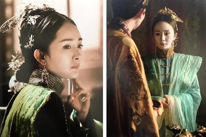 最近网上曝光了北斋删减戏份的造型,她穿着青色的宫装,盘起了发髻,发髻间还插满了华丽的头饰,这大概是大幂幂有史以来最端庄的造型了吧。