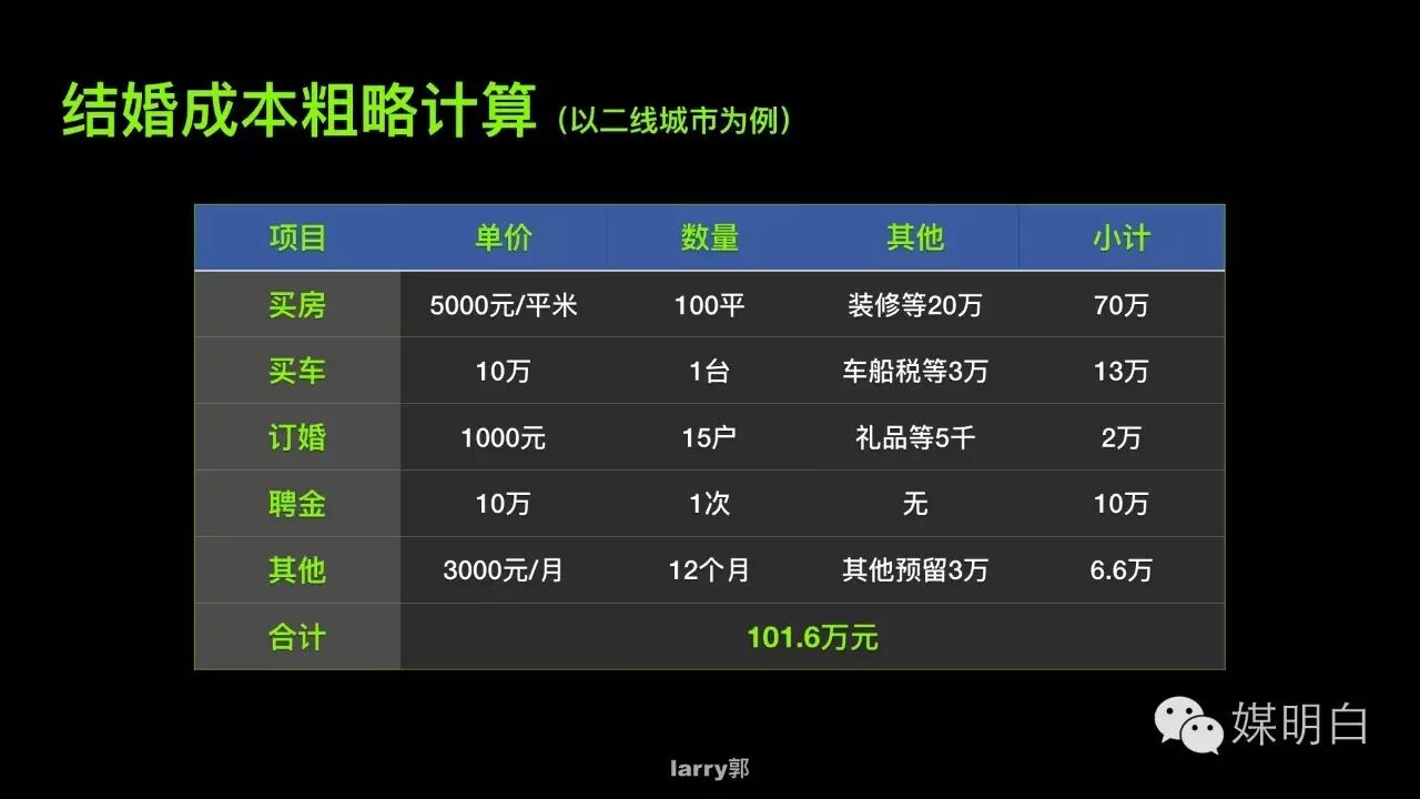 虽然现在生活比以前宽裕了很多,但是结婚标配也水涨船高:从最初的一直大雁,但上个世纪的“三大件”(自行车、冰箱和彩电),再到现在的订婚、买房、买车等项目的增加,使整体聘金水平明显提高到一个前所未有的高度。