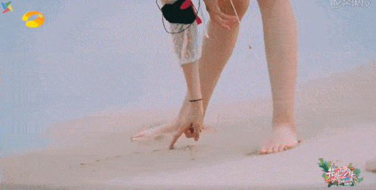 娜扎在沙滩还会写张翰的“H”,再画个心。