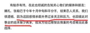 至于分手原因,也仅仅是用“因为这段感情承载外界太多的关注和压力,也因彼此对事业的追求聚少离多”简单带过。