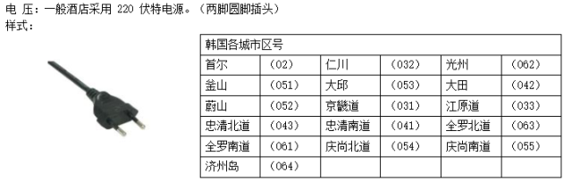 电 压:一般酒店采用 220 伏特电源。(两脚圆脚插头)