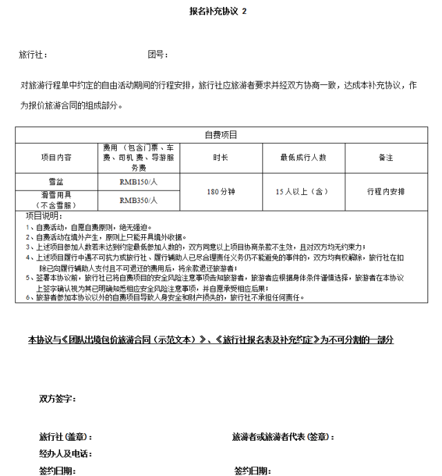 8、客人必须全程随团队旅游,确需离团自行活动者,应到当团领队处办理手续,离团费1000元/天。