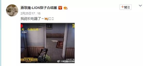 “雨神”萧敬腾不仅是一名歌手,还是一名游戏玩家,最近热爱游戏的他也玩起了《绝地求生》的手游《绝地求生:刺激战场》,还在微博上晒出了自己的“吃鸡”图。