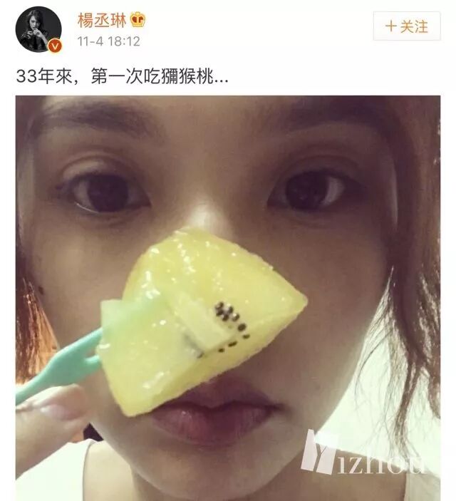素颜发了张自拍,说自己33年来第一次吃猕猴桃,说真的,有点萌~