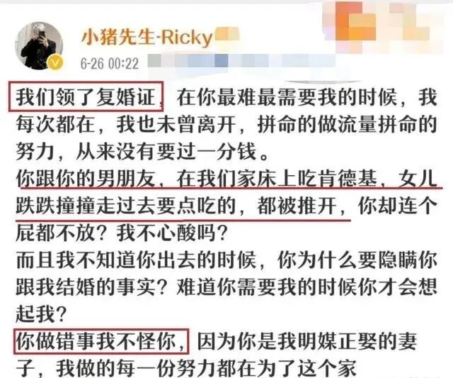 韩安冉和她第一任丈夫小猪先生(本名邱斯钿)离婚又复婚的过程按下不表,单是二人离婚后的撕逼大战就足以让人看得目瞪口呆。