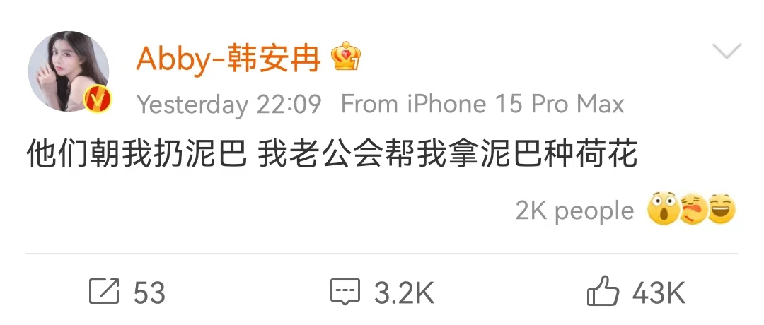 一边是韩安冉本人对前夫现任妻子的各种喊话。