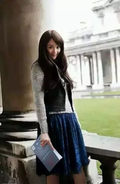 灰色毛衣搭配蓝色蕾丝裙,很常见的穿搭,外套皮衣小马甲,很有层次感。