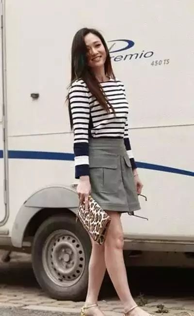 条纹衫搭配半身裙,非常有女人味,搭配一双高跟鞋,凸显纤细腿部线条,性感极了。