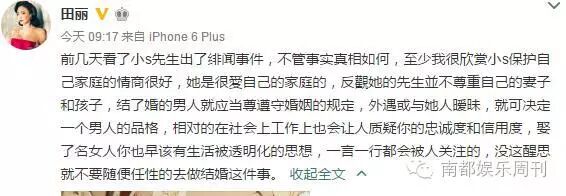 6月18日,田丽在微博PO文,透露前几天看了许雅钧的绯闻事件,很欣赏小S保护家庭的情商,称小S很爱自己的家庭,不过反观Mike,则直言他并不尊重自己的妻子和孩子。田丽认为已婚的男人本就该遵守婚姻的规定,“外遇或与她人暧昧,就可决定一个男人的品格”,相对的在各方面的忠诚度及信用度也会受到影响。