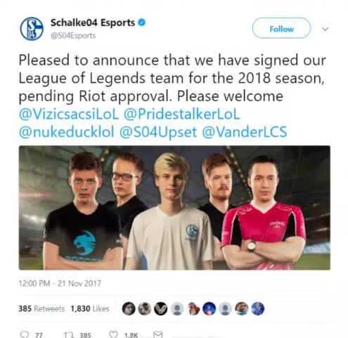 有意思的是,2017年EU LCS升降级赛,沙尔克04不敌Misfits,升入顶级联赛的后者成功打进全球总决赛,前者则在2017年夏季赛后重返顶级联赛。
